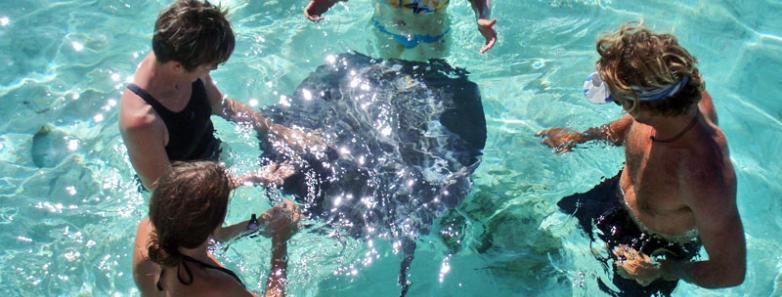 The outlet includes a stop with sharks (black and gray tip) outside the lagoon and the stingrays inside