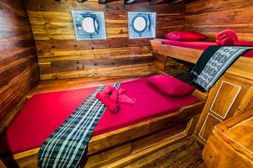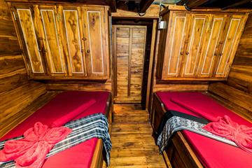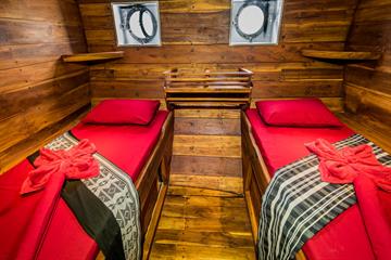 The twin cabins boast large beds and are naturally vented. Amenities include wardrobe, computer/gadget desk, portholes, fan.