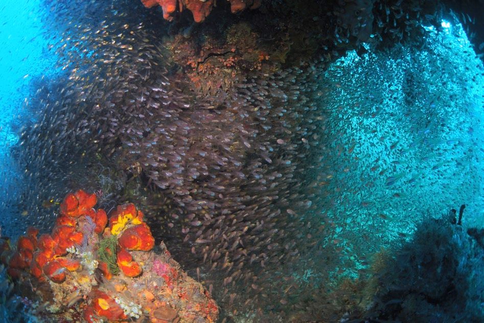 Day 7 A fourteen to sixteen hour, overnight crossing brings us to Pulau Koon, a small island sat south east of mainland Seram, and, the midpoint of our trip... With a large reef plateau jumping right off of the island, the most exciting feature here is, without a doubt, the huge amount of schooling and hunting fish species, that can be seen at the very aptly named Fish market... Slowly moving along the wild and vivid coral slopes in the currents and back eddies, being approached by curious Mackerel and Tuna, surmises a not so typical day... After two dives on this absolutely fantastic reef, late afternoon, we begin our crossing to Misool, Raja Ampat...