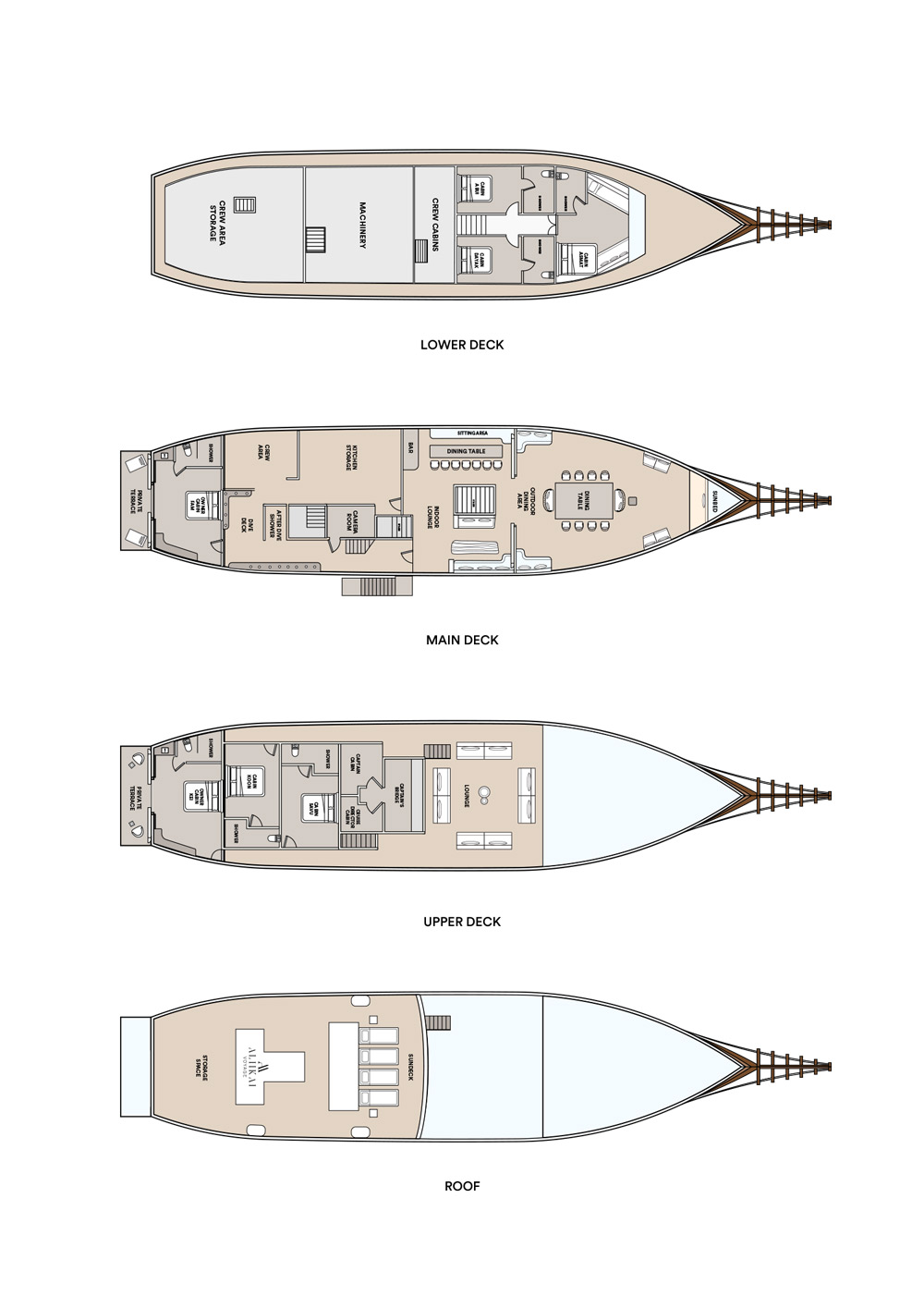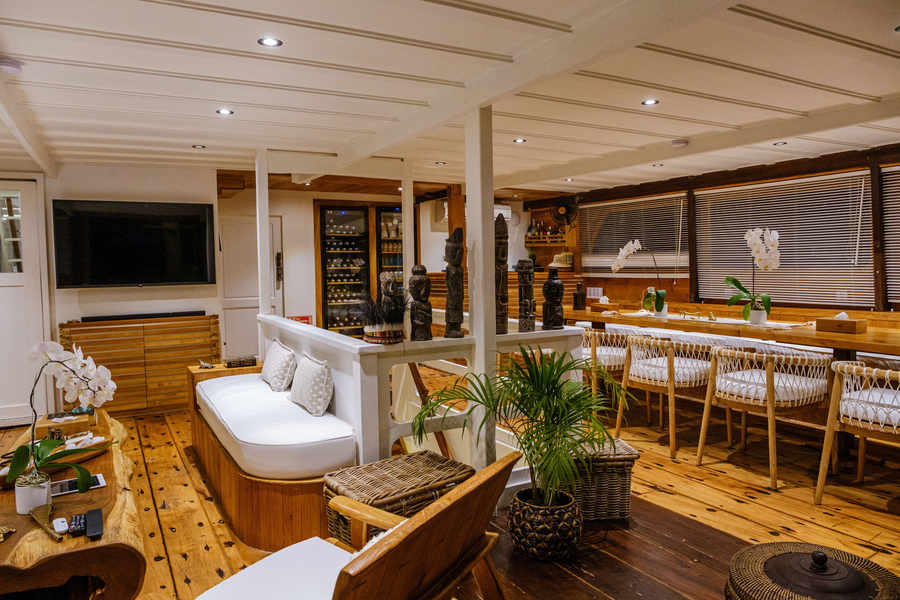Aliikai offers its guests a total of 7 cabins located over 3 decks. There are two Master Suites that are located at the stern and that come with their own private terrace. The Staterooms are spread out between the upper and lower decks, outfitted with a king-sized bed that can be split into 2 single beds, or a queen-sized bed. There is also a cabin located at the bow that is equipped with an additional sofa that can be transformed into a single bed. Each cabin is air-conditioned and complete with ensuite bathrooms and wardrobes. The cabins are also adorned with carefully selected items collected from previous trips in order to pay tribute to the liveaboard's Indonesian history.