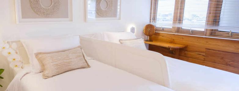 The Staterooms, located on the upper and lower decks, offer a king-sized bed that converts into two singles or a queen-sized bed, along with air-conditioning and en-suite bathrooms.