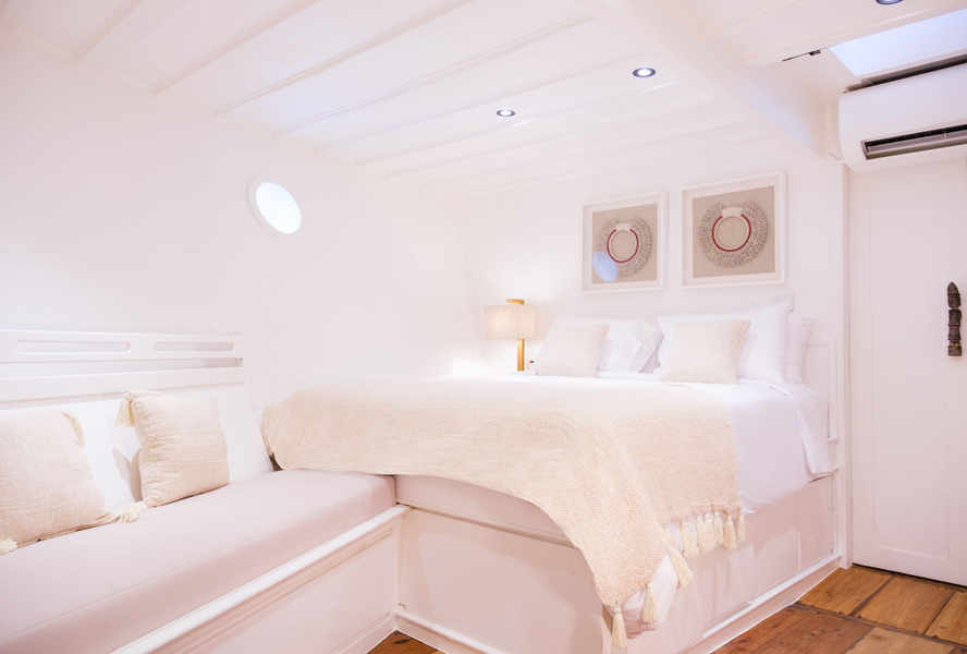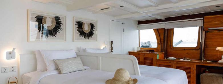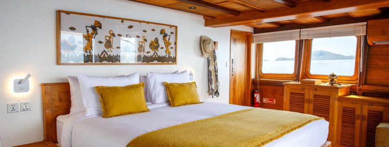 There are two Master Suites at the stern feature private terraces, air-conditioning, en-suite bathrooms, and décor reflecting the liveaboard’s Indonesian heritage.