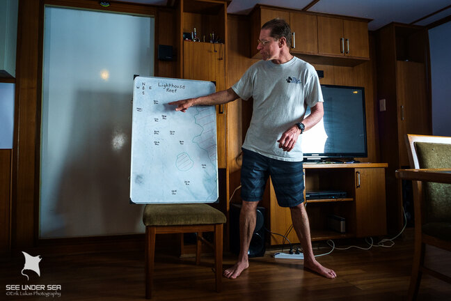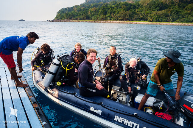 Left: Mark Strickland doing a dive site briefing Right: Excited for the first dive in the Andamans