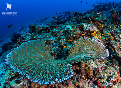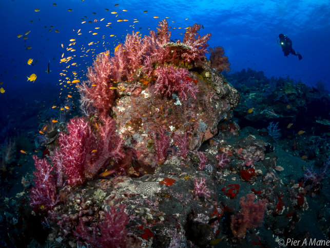 Our first dive was at HQ Pinnacle, a rocky shoal that tops out only 15 feet below the surface, making for a perfect multi-level dive. Winding our way among the peaks, valleys and canyons, we were greeted by a large school of bigeye trevally, as well as a parade of muscular dog-tooth tuna. While coral is rather scarce in the shallower areas, the reefâs deeper edges are festooned with orange fan corals, pink soft corals, and large barrel sponges. Passing schools of fusiliers complemented the scene, providing some great wide-angle photo ops. For those who were more macro-inclined, there were plenty of colorful reef fish, including highly photogenic palette surgeonfish, regal and emperor angelfish, and a newly discovered dottyback species.