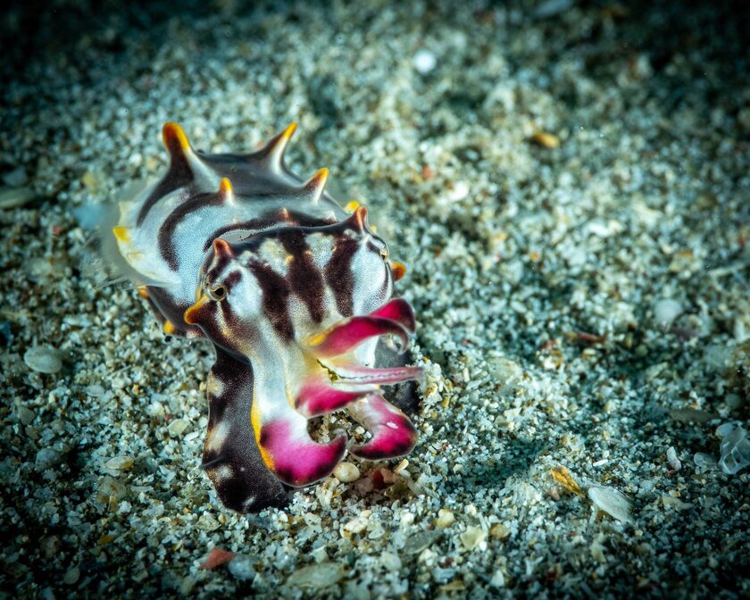 Virtually every variety of juvenile fish and critter imaginable can be found in Anilao. You'll definitely want to bring your best underwater camera. Shrimp, crabs, nudibranchs, small squid, and cuttlefish are arguably more plentiful than any other dive destination. Frogfish, pipefish, and seahorses are also fairly common, and we've even seen Rhinopias and Hairy Frogfish. Wonderpus, mimic, and blue-ringed octopus can also be seen.
