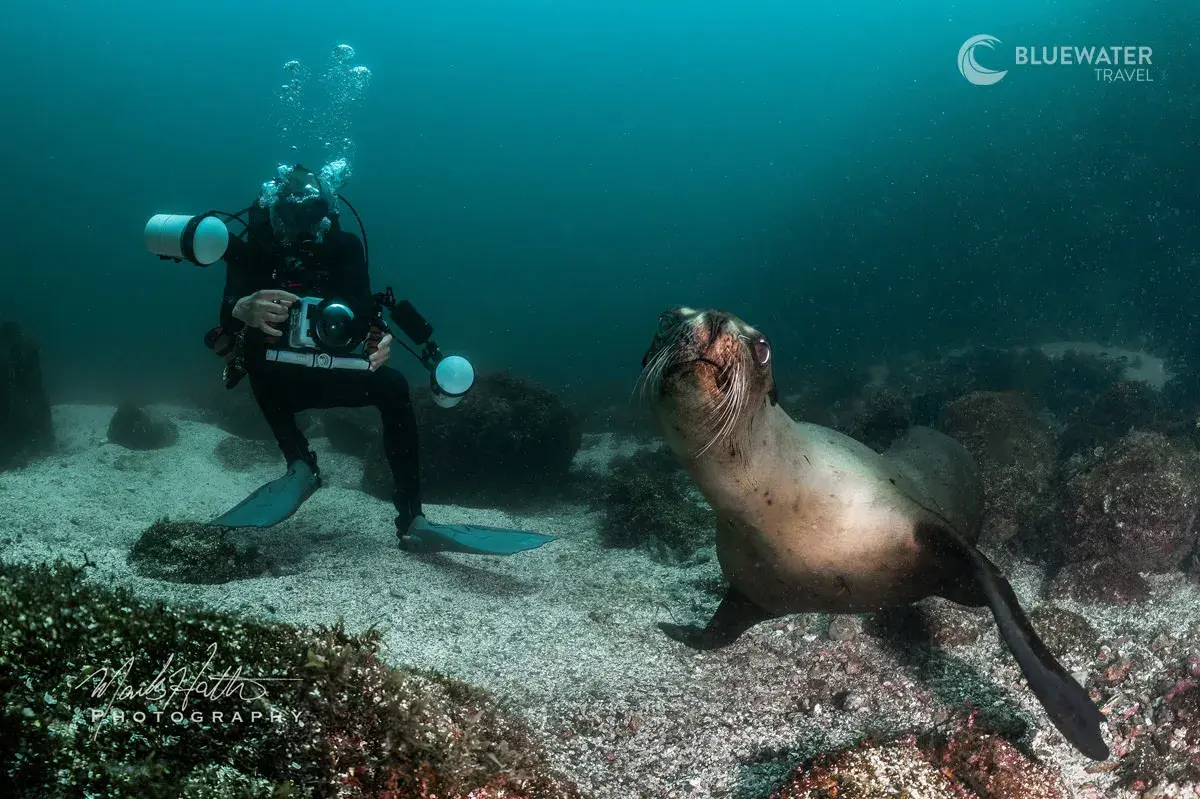 Hanging with a California Sea Lion is one of the most coveted interactions for a scuba diver. This species is known to be extremely intelligent, and can even be taught to perform! For that reason, many people refer to them as underwater dogs. Just like dogs, sea lions can be territorial and aggressive if approached in the wrong way, but if divers are respectful and open they often approach playfullyblowing bubbles, investigating fins or cameras, and sometimes even rolling over for belly pets!