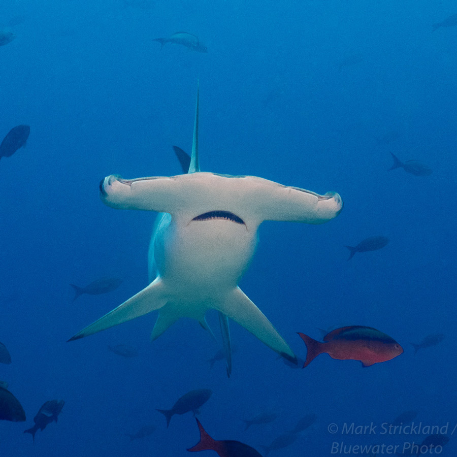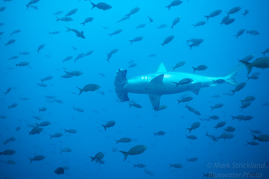 Darwin Island! While each of the islands offers its own special attractions, Darwin is by far the most celebrated by divers, especially for the incidence of big animal encounters. In fact, combined, Darwin and Wolf are thought to have the highest population of sharks in the world. All of our dives at Darwin were at the same site, at the base of the iconic rock archway that collapsed in 2021, resulting in its new name, Pillars of Darwin. Our first dive started with overcast skies, but there was nothing gloomy about the scene once we submerged. We had barely started our descent when several massive Galapagos sharks appeared, calmly cruising across the reef top, accompanied by schools of Pacific creole wrasse. Due to the famously strong and unpredictable currents, we started each dive with negative entries, heading immediately for the bottom, then found a spot to tuck in out of the worst of the current. A wide variety of reef fish were in attendance, including parrotfish, trumpetfish, leather bass, bigeye, black and bluefin trevallies, king angelfish, rainbow chubs, milkfish and many others. Many crevices were inhabited by fine spotted morays, mouths agape displaying their impressive teeth. On most dives, before even reaching the bottom we were seeing squadrons of scalloped hammerhead sharks in mid-water, weaving among clouds of creolefish, casually making their way against the stiff current. Once everyone got settled among the rocks, the hammerhead sightings increased in frequency, becoming nearly continuous most of the time. Unlike shark sightings at most locales, which are typically just fleeting moments, the hammerheads at Darwin and Wolf seemed to be on a carousel, resulting in a nearly constant stream of them passing before our eyes and lenses. Not everyone saw them in large numbers, but several of our group were treated with the awesome sight of dozens at a time! Even without the sharks, the diving at Darwin would be superb, but watching these impressive predators in such numbers was a rare privilege.