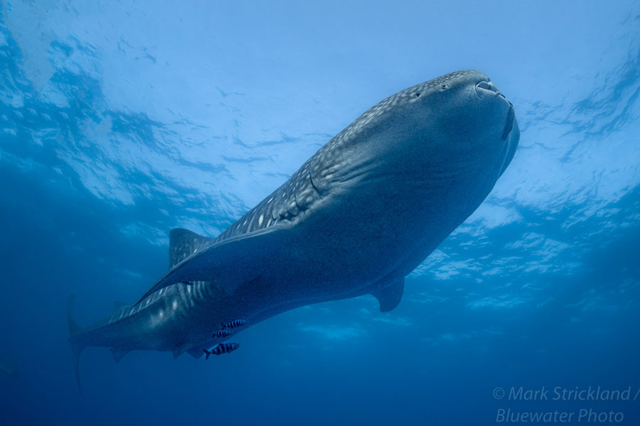 While many trips include only a single day at Darwin, our trip was designed to maximize time there, with 4 dives on each of two days at this fabulous site. As our time there flew past, each dive seemed to top the previous one, many times including appearances by gamefish like hefty almaco jacks and yellowfin tuna, and during blue water safety stops, wahoo - up to eight at a time! On nearly every dive, we were greeted by several large Galapagos sharks as soon as we began our descent, which were soon followed by hammerheads. Nearly as numerous as the hammerheads were green turtles; at nearly any moment there was at least one cruising past, often three or four. And, unlike the sharks, they seemed totally unconcerned about us divers, frequently swimming right up to investigate us. As if all this werent enough, each of our days at Darwin and Wolf included at least brief appearances by the largest of all fish, often the size of a school bus a whale shark! Most of the time these massive animals cruised past just on the limit of visibility, and while seeming to swim in slow motion, quickly outdistanced our vigorous swimming efforts. As is typical in this region, all were adult females, easily measuring 40 feet in length, and judging by their swollen bellies, were likely pregnant. We also observed a fascinating interaction between species that most of us had never heard of before almost every whale shark was accompanied not only by the usual remoras, jacks and other hangers-on, but also one or more large Galalpagos sharks! According to Ivan, these opportunistic predators follow the whale sharks closely, looking for opportunities to prey on the remoras that are typically found clinging to the spotted giants. This amazing action continued right up to the last dive at The Pillars - as we moved into the blue for a last look before ascending, another whale shark, this time a bit smaller (only 30 feet or so) made several appearances before fading into the distance. What a great finale to our time at Darwin!