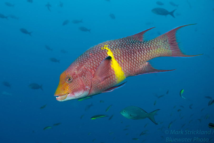Due to the distance to our next destination, it was suggested that we do only one dive this day, at a fringing reef just off Baltra Island. Underwater terrain consisted of a rocky reef covered with yellow-polyp black corals, sloping steeply to a white sand bottom. Marine life included an abundance of schooling grunts and goatfish, small groupers, garden eels, two stingrays, and several Mexican hogfish. It was an easy, relaxing dive, a good prelude to the more vigorous conditions expected at the northern islands of Darwin and Wolf where we were headed next.