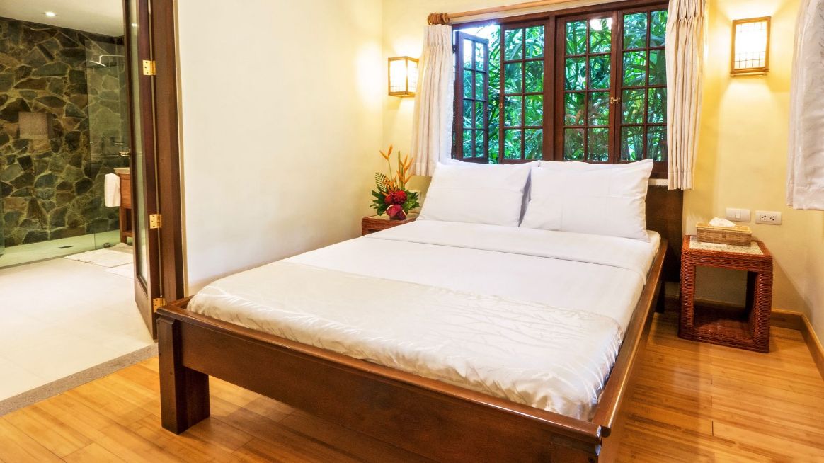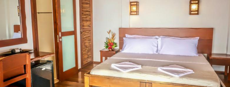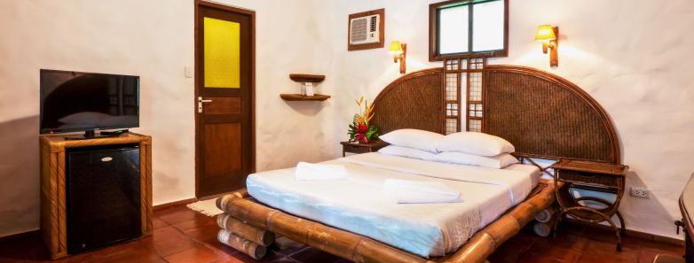 Private, comfortable rooms with either a king bed (or twins) or a queen bed, ensuite with shower, safe, A/C, ceiling fan, cable TV, minibar, and refrigerator.