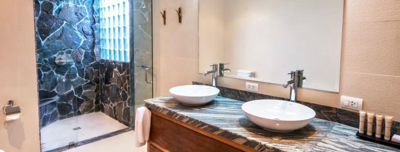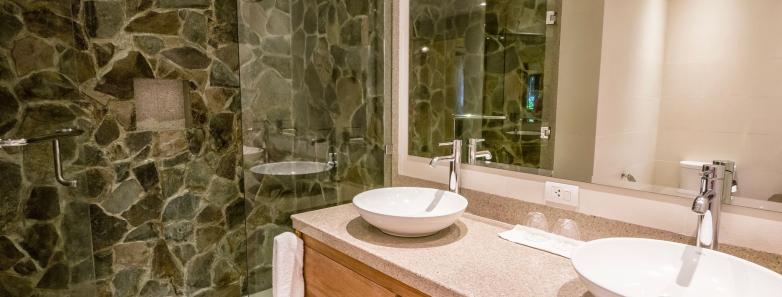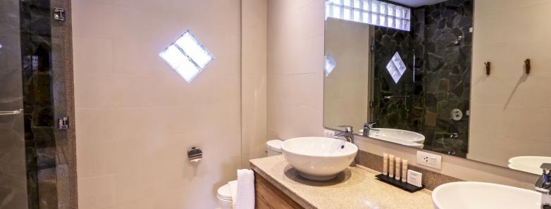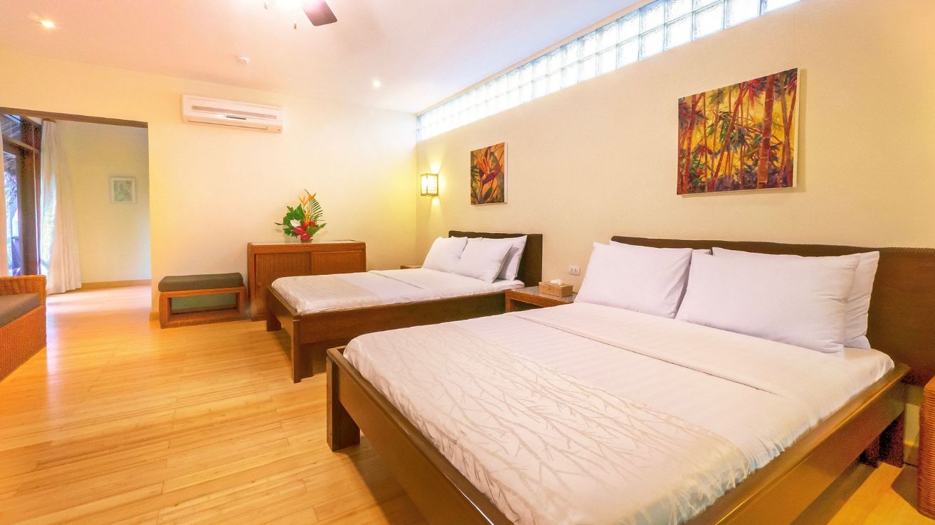 Two-bedroom suites with a queen bed and king (or twins), shared ensuite with shower, safe, A/C, ceiling fan, cable TV, minibar, refrigerator, and coffee/tea maker.