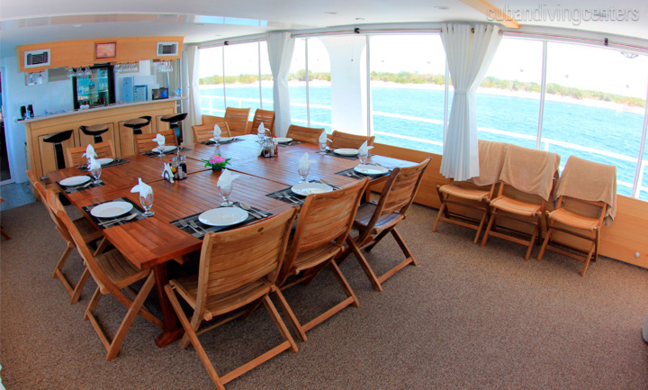 - Together with the instructor, arrange time for afternoon dives or for excursions through the lagoon and mangrove channels. Coming back to the live aboard, it is time to drink a frozen mojito, enjoy the afternoon pizza and talk about the dives. Around 8:00 pm, dinner is served and, like a family, everyone gets together around the table. Evening time next to the bar, to watch photos and videos while breathing the sea atmosphere, its time to plan with the instructors what will happen next day.