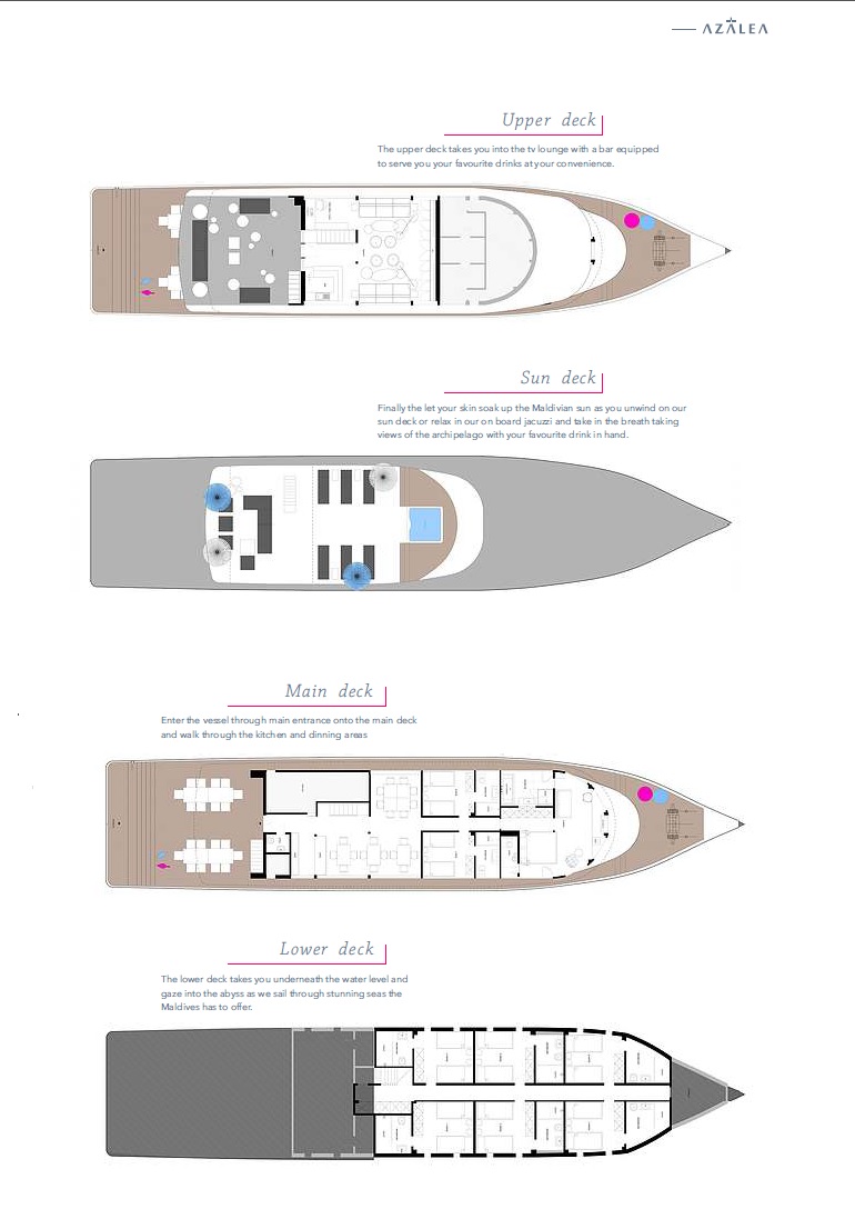 The Azalea (Azalea Cruise) is a luxurious 125-foot steel yacht, offering spacious accommodations, and 5-star services and amenities for up to 18 divers.
