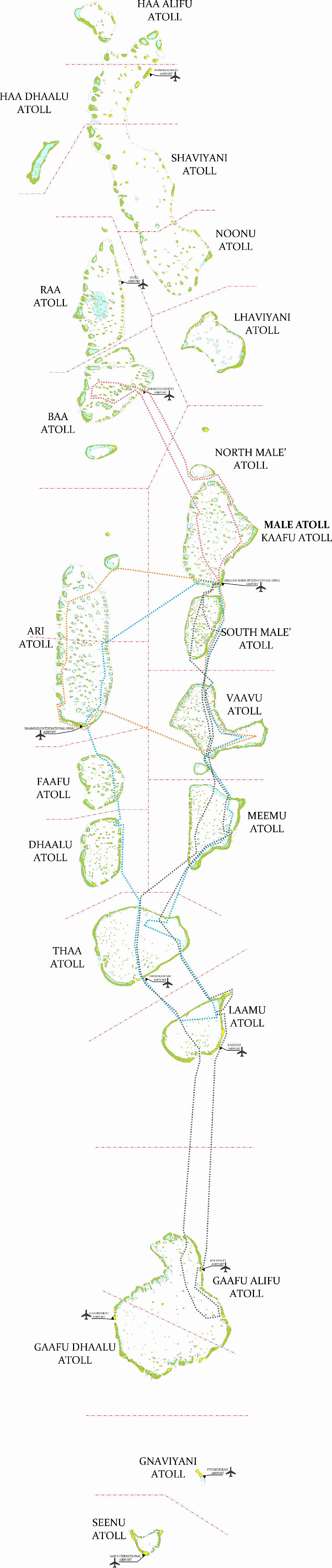 - North Male - South Male - Felidhe Meemu Atoll - Thaa Atoll- Laamu Atoll Gaafu Atoll