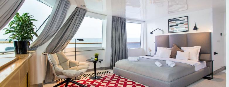 The most spacious cabin on board, theOcean View Master Suite features panoramic windows, a king bed with Egyptian linen, and a luxurious en-suite bathroom with a bathtub and separate shower.