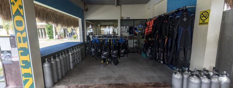 The Azure Dive Resort Dive Center is fully equipped to provide you with all your diving needs. In addition to their in-house dive shop, they also have an air-conditioned camera room where 110-240v electrical outlets are provided for your appliances.