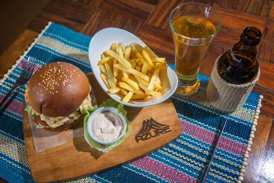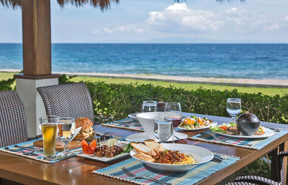 The Beatriz Restaurant, the resort's in-house restaurant, is named after the owner's good friend Beatriz Zobel, Jr. It was her interest and love for Filipino culture that influenced the concept and ambiance of the Azure Dive Resort. The restaurant keeps in theme by showcasing Filipino artistry. Solihiyapendant lamps from Albay are displayed in the center, while Pampanga carvings hang above the buffet complimented by cylindrical lamps from Triboa Bay Living. All meals at the Beatriz are pre-arranged; however, guests may request for specific dishes provided that the ingredients are available at the local market. They are also open for A la Carte dining.