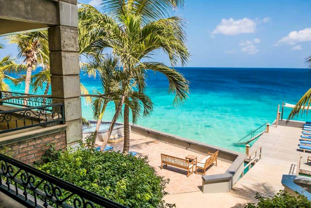 A spacious 538 sq ft oceanfront suite with one bedroom, living area, fully equipped kitchen, and private balcony overlooking Klein Bonaire.