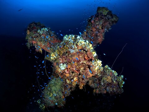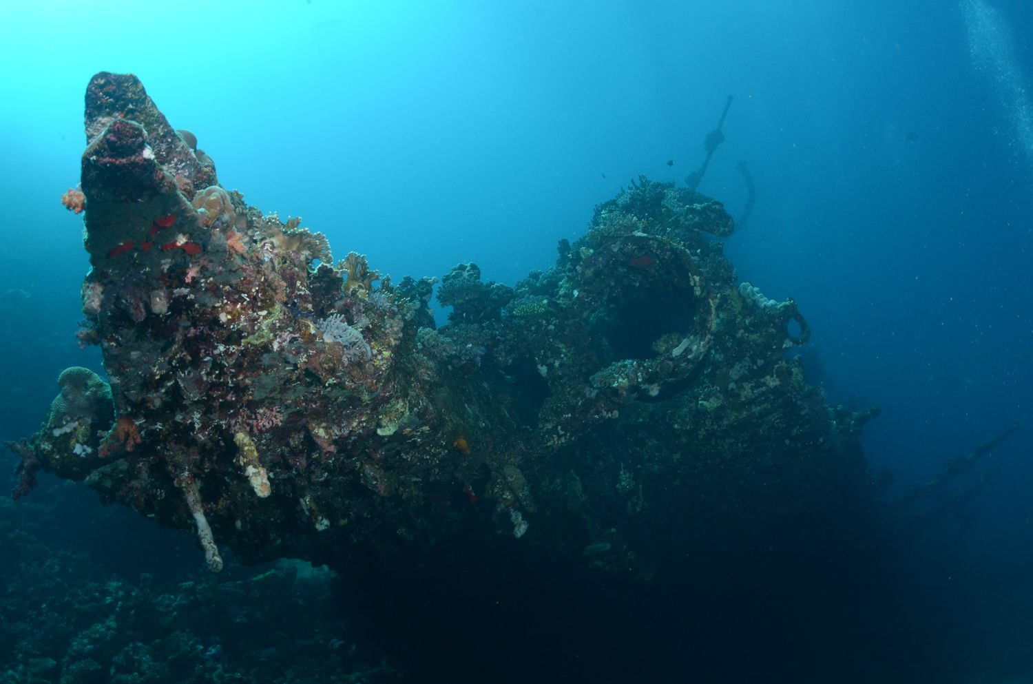 Much of the wreck's outside is encrusted in coral, attracting a wide variety of marine life, including some interesting macro. In particular, the guns at the bow and stern, misshapen by colorful sponges and crinoids, make for a fantastic photo. Keen eyes might also spot one of a variety of shark species patrolling between the wreckage.