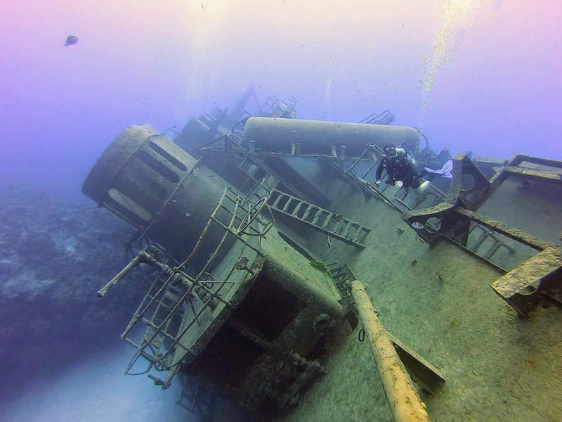 The Japanese oil tanker Iro Maru is one of over 60 military ships that were sunk in Palau during WWII. Today, many of the wrecks have been salvaged or removed; however, the vast Iro Maru is considered one of the best remaining to explore. She sits upright at a maximum depth of 130ft, with much of the deck, bridge, and mast above 80ft.