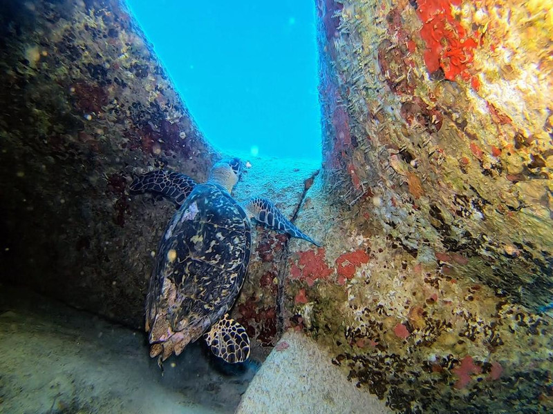 A turtle on the USS Kittiwake shipwreck in the Cayman Islands