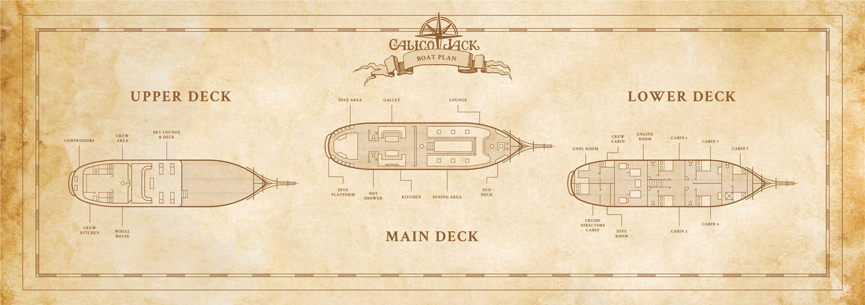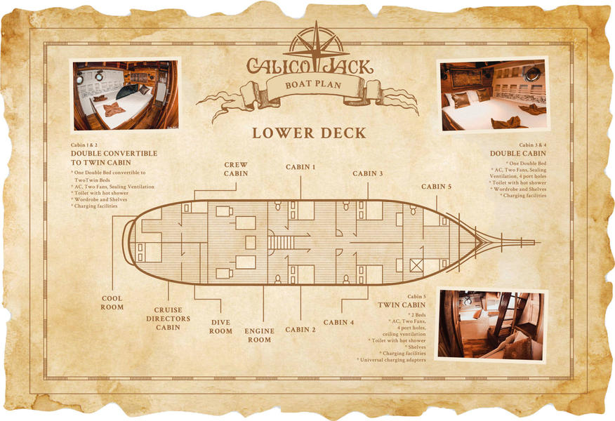 Calico Jack can comfortably accommodate up to 10 guests in 5 unique yet comfortable cabins. There are two double-bed cabins, 2 double or single-bed cabins, and 1 twin cabin available. Each cabin comes complete the following: