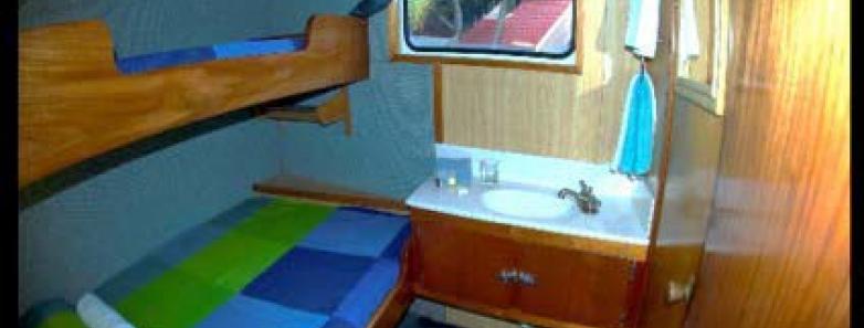 All nine cabins feature bunk beds (one matrimonial, one individual), air conditioning, and comfortable furnishings. Lower deck cabins share two full bathrooms, while upper deck cabins have private en-suite bathrooms.