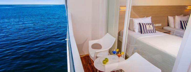 The Catamaran Treasure offers the following accommodations types: Balcony Stateroom, Master Suite - Double and Master Suite - Triple. The Balcony Stateroom is located on the Main Deck with 4 of the Master Suites, while the rest are located on the Upper Deck. The Balcony Stateroom is outfitted with a queen bed and a single, while the Master Suites have either twin beds or double beds. Two of the upper deck cabins have a double bed and a single bed. All accommodations are fully air-conditioned and feature a private balcony with a sea view.