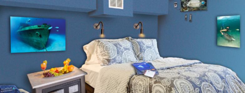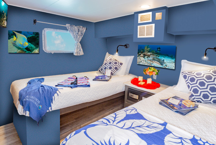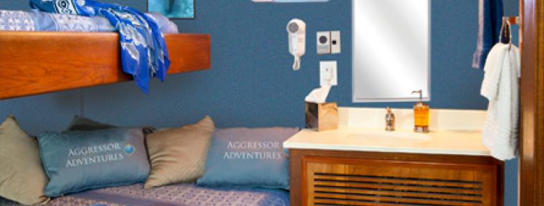 Accommodations include one master stateroom, six deluxe staterooms, each having two single beds or a king, and two bunk-style deluxe staterooms. All staterooms have climate controls and private bathrooms. The Cayman Aggressor IV sleeps 18 guests in privacy and comfort.