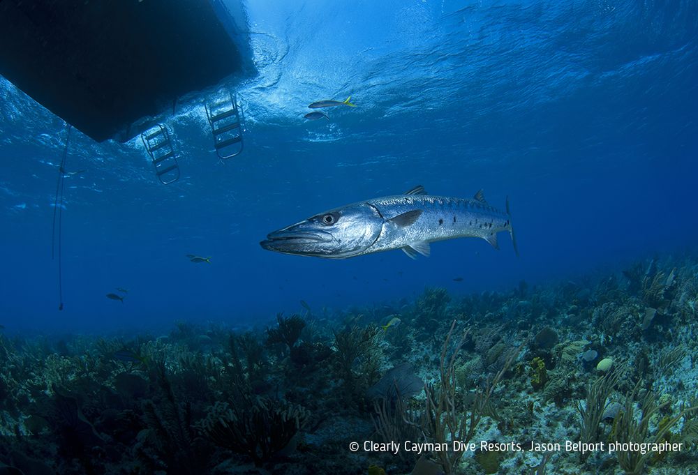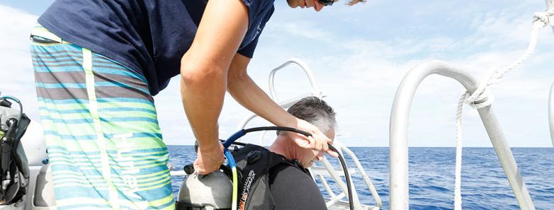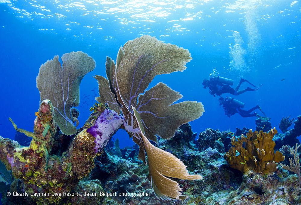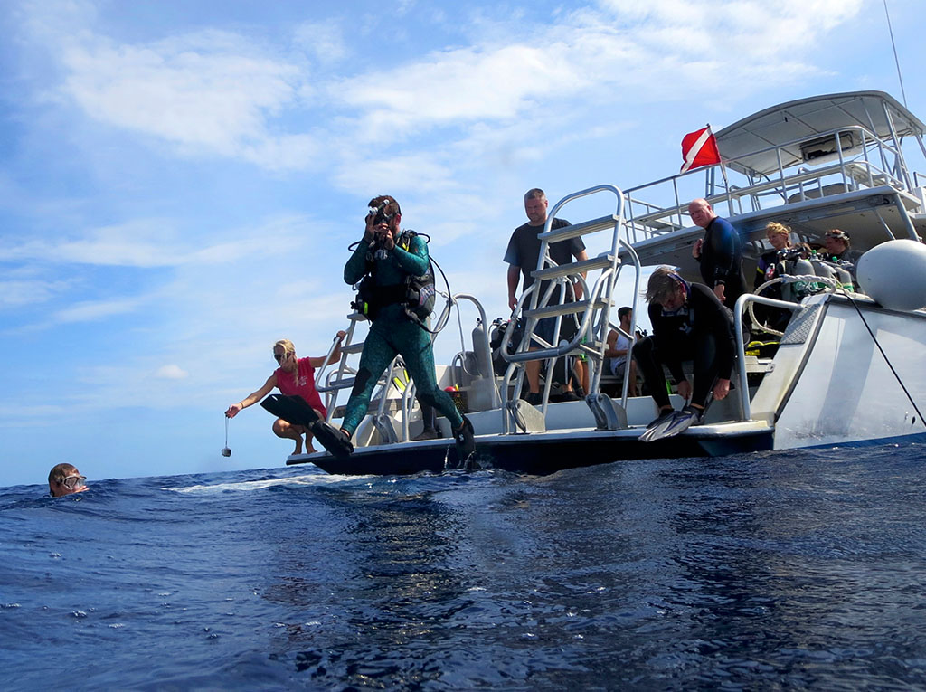 Divers may follow the guide or choose to go off on their own within the established dive profile. Gearing up is as easy as getting gear on the boat. Reef Divers does the work. Guests sit on wide, stable platforms on the rear of the boat and the staff brings their tank and BCD to them. After helping don the gear and stand up its one giant stride into the beautiful Cayman Caribbean. And at the end of the dive, divers may hand up their fins and climb the ladder out or opt to remove all gear in the water.