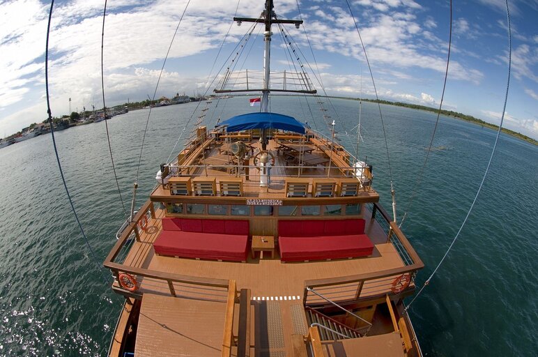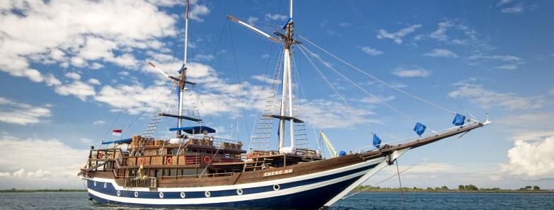 Cheng Ho is a 33-meter luxury phinisi schooner in Indonesia, accommodating up to 24 guests in 14 air-conditioned cabins, offering exceptional diving experiences in Komodo and Ambon.