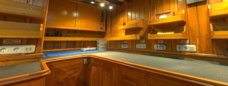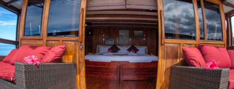 The vessel has 7 staterooms with a choice of single cabins, twins, doubles or two spacious master cabins. Cabins 1 and 3 can be configured with a double bed or two single beds, while Cabins 2 and 3 contain a double bed. Cabin 5 and 6 are the biggest cabin at 40sq. meters and 35sq. meters, respectively. Both can have a king-sized bed or two large single beds and offer an amazing view of the ocean. Cabin 6 also comes with its own private balcony. Cabin 7 can be configured with a king double or twin beds and has direct access to the sun deck. All cabins come complete with a desk, wardrobe, reading lights, and a bedside table. All rooms are also fully airconditioned.