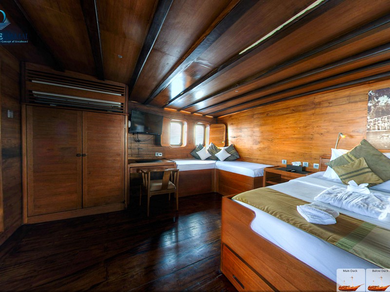 The below-deck accommodation has been designed to accommodate single or twin occupants in a level of luxury not seen on another vessel in Indonesia. Cabins 1 and 2 are 20sq. meters and are fitted with a double bed and a day bed; while Cabins 3 and 4 are also cited with a double bed and day bed, but have a bigger floor area of 25 sq. meters. Cabins 5 and 6 are the Master Cabins, with a massive 40sq. meters and contain a king-size bed and a narrow day bed. Cabin 7 is 18sq. meters and can contain a king double or twin beds. This cabin also has direct access to the sun decks. Each cabin also contains a desk, a flat-screen TV, and a complete en-suite bathroom. All cabins are also fully air conditioned.