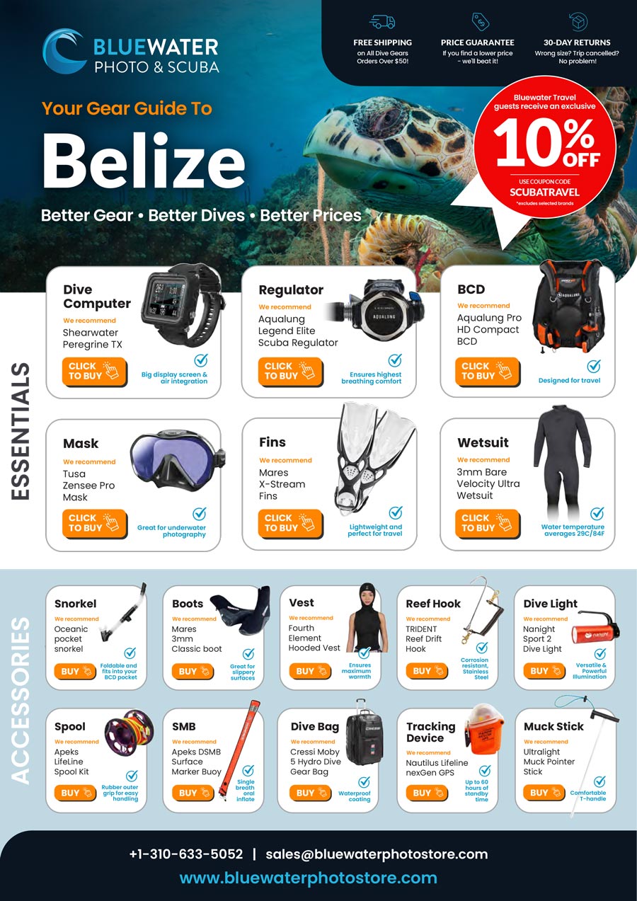 Download our full scuba gear guide to Belize, Bluewater Travel guests receive 10% OFF!