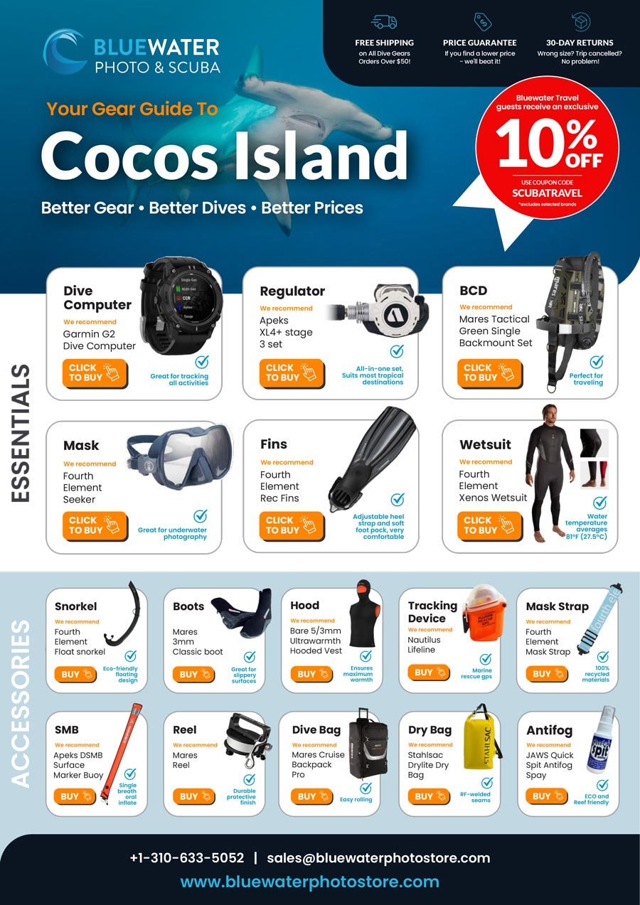 Download our full scuba gear guide to Cocos, Bluewater Travel guests receive 10% OFF!