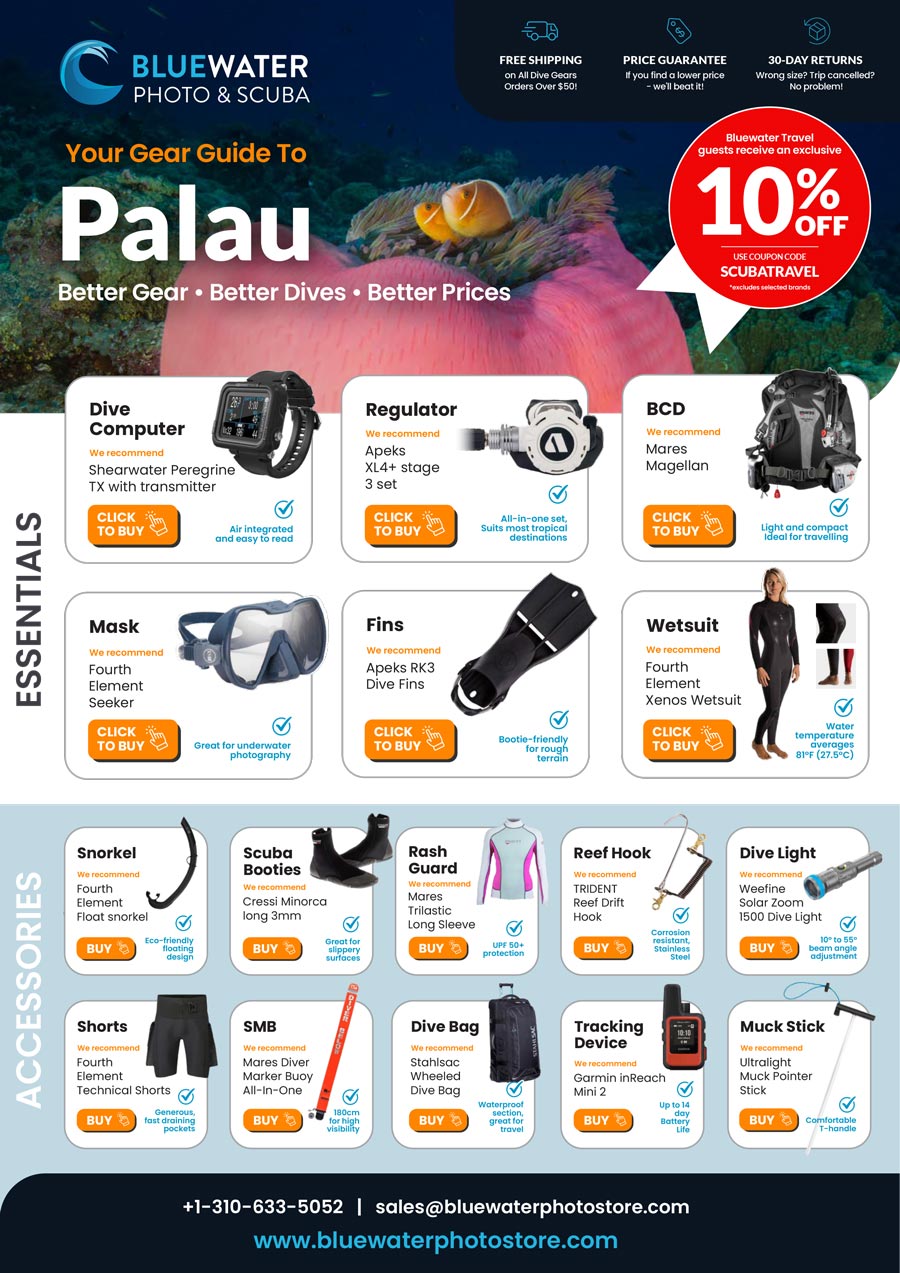 Download our full scuba gear guide to Palau, Bluewater Travel guests receive 10% OFF!