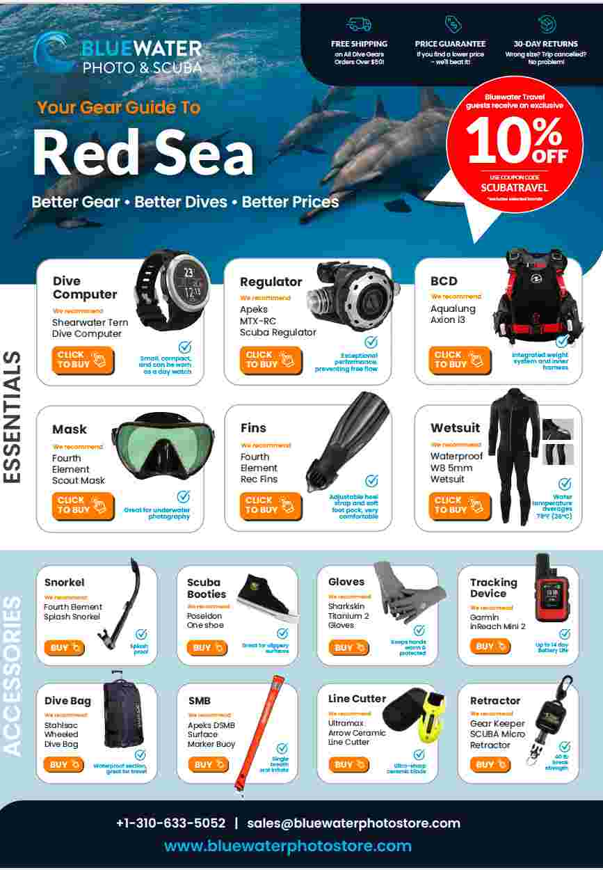 Download our full scuba gear guide to Red Sea, Bluewater Travel guests receive 10% OFF! Click the image below to download (PDF).