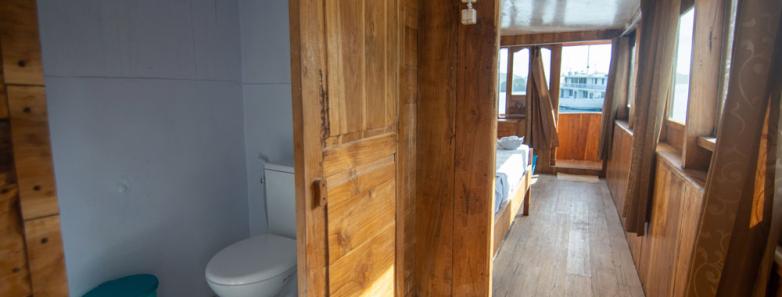 The boat has 2 double cabins with private bathroom and balcony situated on the upper deck, plus 4 double beds in a dorm setup with shared bathroom on the lower deck.