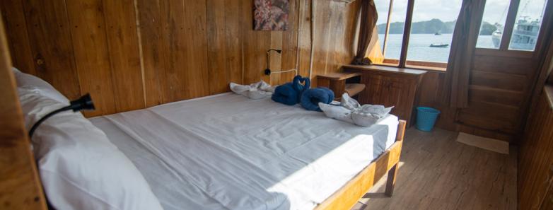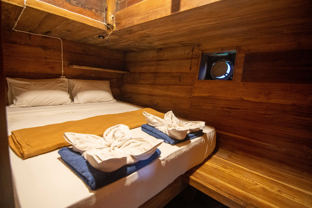 Step aboard the Shenron, a newly refurbished 24-meter phinisi offering exceptional dive cruises to Komodo and Alor. With just four double cabins, the vessel offers an intimate and personalized experience for a maximum of eight guests. Each cabin includes a comfortable double bed, private bathroom with hot-water shower, individual ventilation, charging ports, and ample storage—ensuring a relaxing stay between dives.