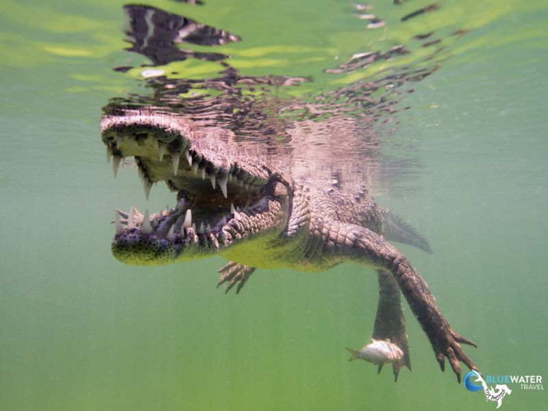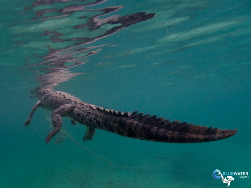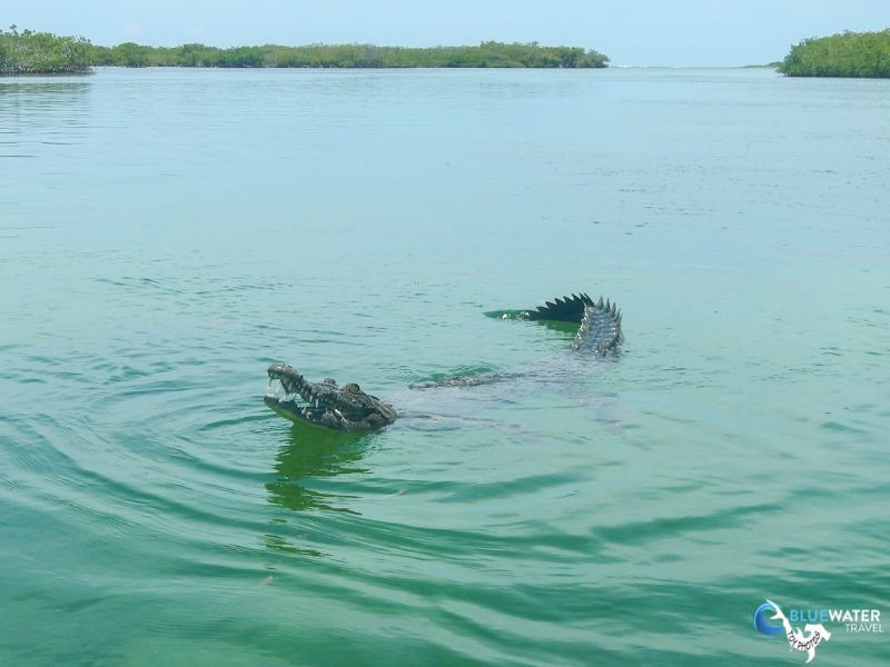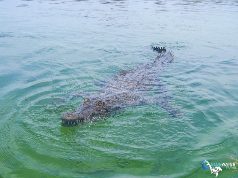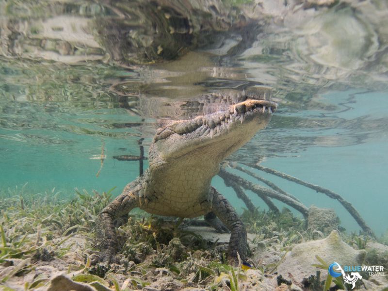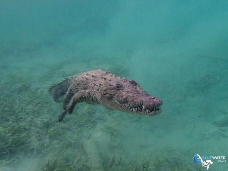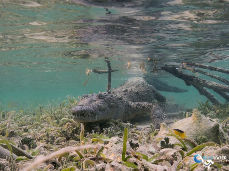 Living up to scuba Cubas reputation, this was a shark and crocodile day! We were surrounded by Caribbean reef sharks and silky sharks throughout the whole of Dive 1 of the day. When we got back to the Halcn, the boat had moved and anchored in the mangrove islands where Nios live. The moment the tender boat tied off to the mothership, the first Nioa 10-foot baby crocodileswam right up to the swim step on cue, awaiting food.