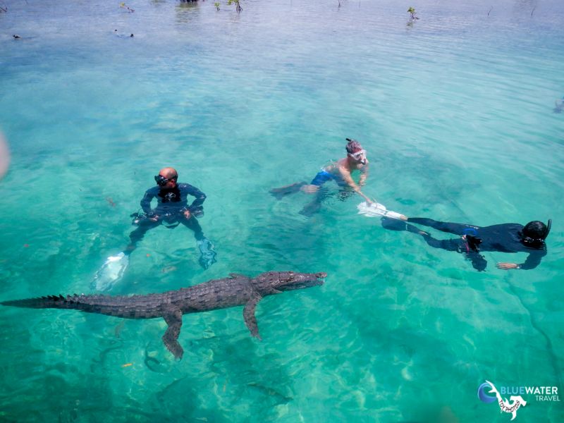 Right when dinner was brought out for the group, a crocodile head appeared on the surfaceNio #2! Although we had already showered and were clean, two of us got back into our snorkeling gear and jumped in. We took photos of the beautiful American saltwater crocodile, swimming with Nio #2 until the sun went down.