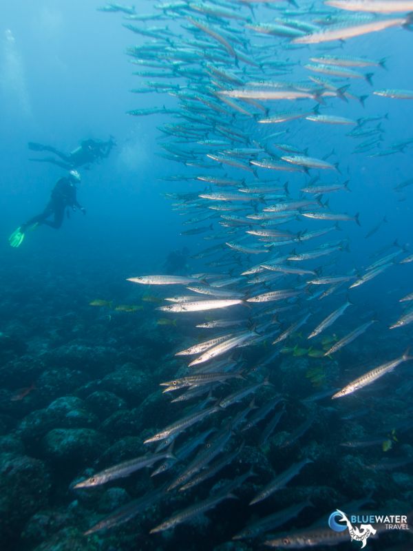 During Week 1, our first dive at the famed Wolf and Darwin islands did not disappoint. Barely 5 minutes into the dive, we were greeted by hundreds of hammerheads cruising by. We spent a good 30 minutes down on the reef just watching the show go by. The rest of the day was more of the same awesome show of hammerheads. The currents at Shark Bay and Elephant Rock were some of the strongest currents any of us have ever encountered, and we really had to be aware of the nasty down currents out in the blue. Galapagos is a place where bubbles dont always go up. Bubbles often go downwards or sideways, pulled by strong currents.