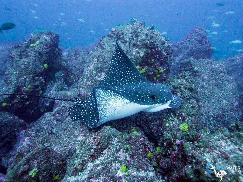Week 1: We woke up in Santiago Island and did a couple of dives at Cousins Rock. We saw a mobula ray, a school of eagle rays, and a number of whitetip reef sharks hiding under rock ledges. On the penultimate dive of the trip, we had a school of mobula and eagle rays put on a show for us. A couple of divers in the group also had a 10-foot tiger shark creep up on them. After lunch, we motored to Santa Cruz Island and embarked on a land excursion to see the Galapagos giant tortoises and some lava caves. We then had a few hours in Puerto Ayora to explore the Charles Darwin Research Station, purchase souvenirs, and have dinner at one of the many restaurants on the boardwalk. Week 2: Our last dive of the trip yielded eagle rays, whitetip reef sharks, some hammerheads, and playful sea lions.