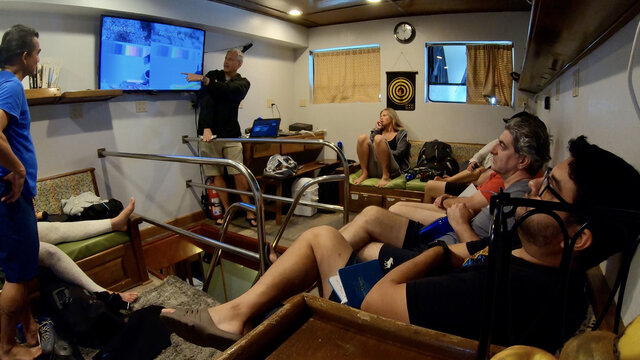 Todd Kortte, an instructor with Bluewater University, held a GoPro seminar after breakfast as there were a number of divers who brought GoPros with them. The divemaster did a general dive briefing after that, with some history of the archipelago and shark identification for the 7 different species of sharks that we might see on the trip. After lunch, most of us indulged in a siesta while we continue our journey toward the Revillagigedo Archipelago. At one point, a couple of humpback whales seemed to be escorting us to Socorro across the wide-open ocean.