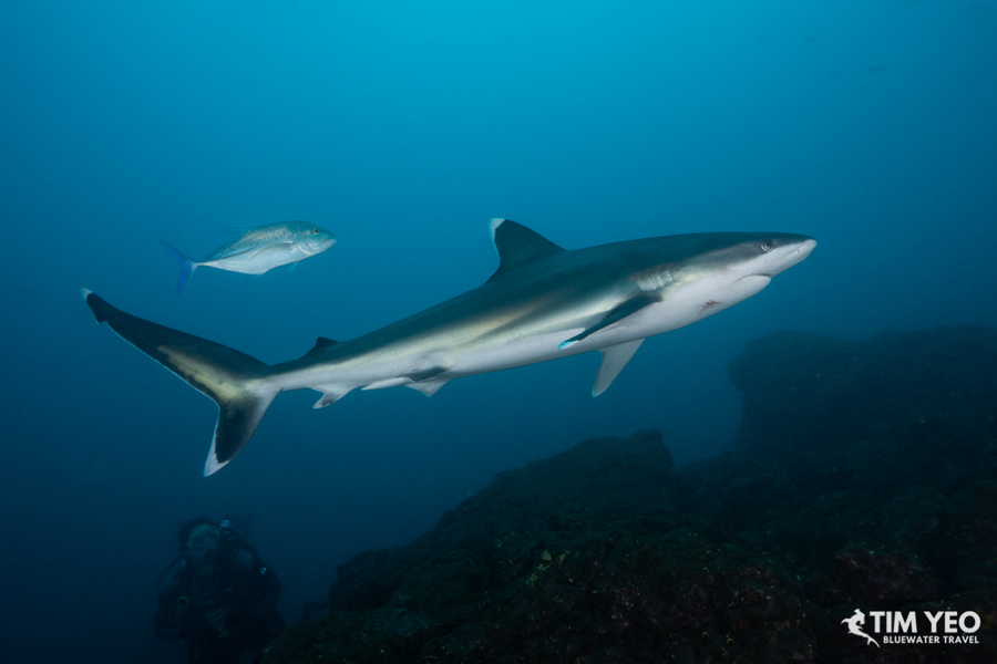 After two dives at the Canyon, we decided to head over to the Boiler to end the trip. The visibility was excellent but there werent too many mantas and sharks so we headed back to the Canyon for the penultimate dive of the trip. We were rewarded with lots of silky, silvertip, and Galapagos sharks, and even had a school of five hammerheads swim through the cleaning station. All the photographers got excellent shots of the hammerheads and many divers had never been closer to a hammerhead shark. At the end of the dive, a massive 20ft black manta came over to the cleaning station and stayed with us for 10 minutes before we had to, unfortunately, start heading up for our safety stop.