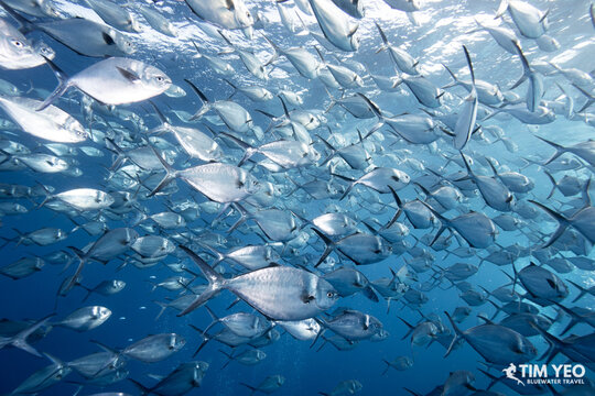 Our third day at Socorro Island, and we had another four great dives at Cabo Pearce. There were lots of mantas again, dolphins, and silky and hammerhead sharks all day. On the last dive, the two groups met underwater and were treated to a large school of pompano near the surface that allowed us to swim in and around them.
