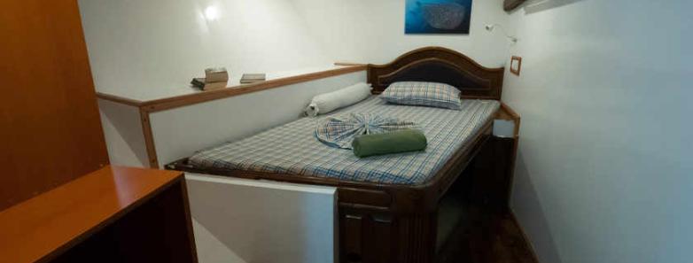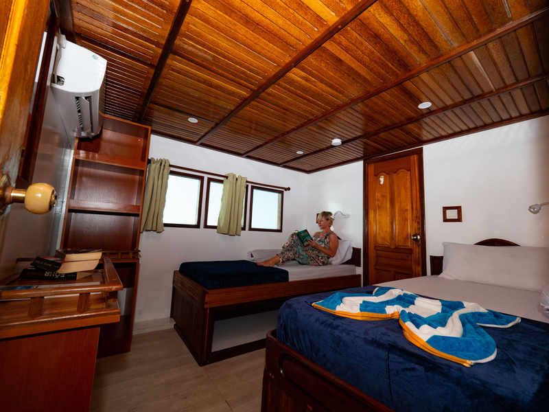 The EcoProMariana Liveaboard has 9 air-conditioned cabins, each with its own bathroom and individually controlled air conditioning. The cabins have a mix of modern and traditional decor, providing a comfortable and relaxing atmosphere for guests. The bedding consists of either twin or double beds, depending on guests' preferences, and each cabin has storage space for personal belongings. Additionally, the cabins have large windows, allowing natural light to enter and providing views of the beautiful Maldivian seascape.