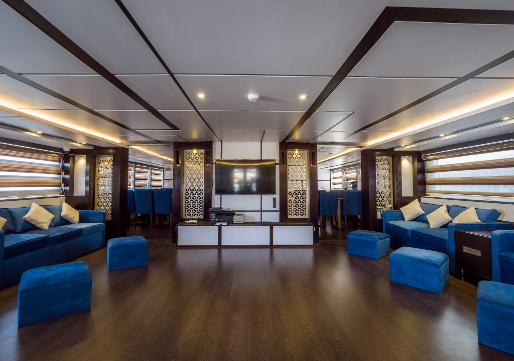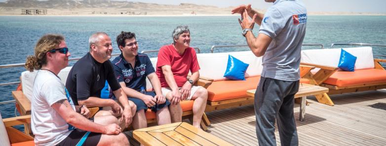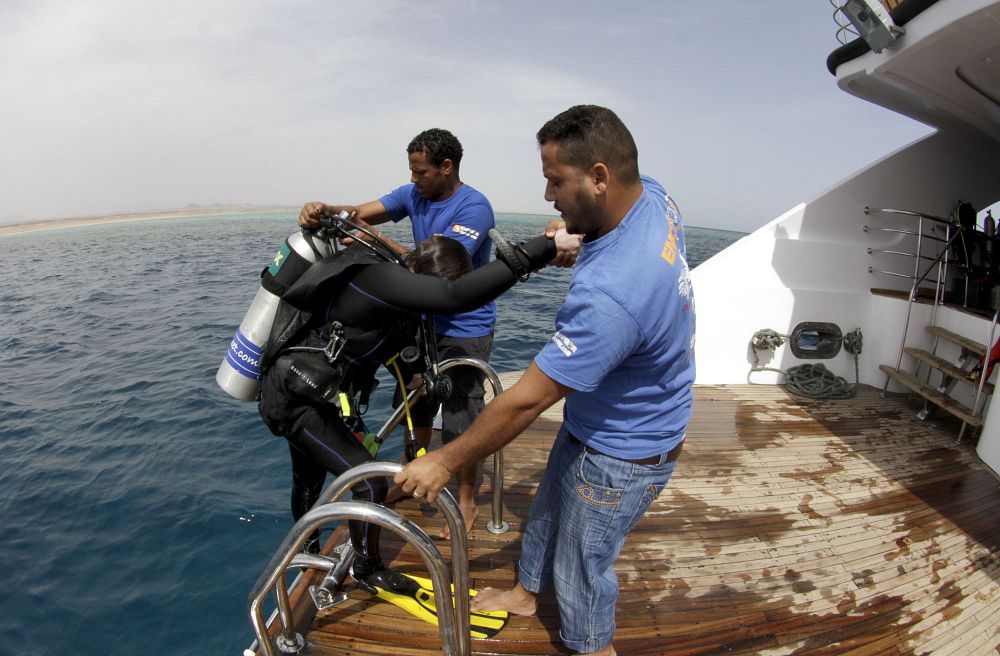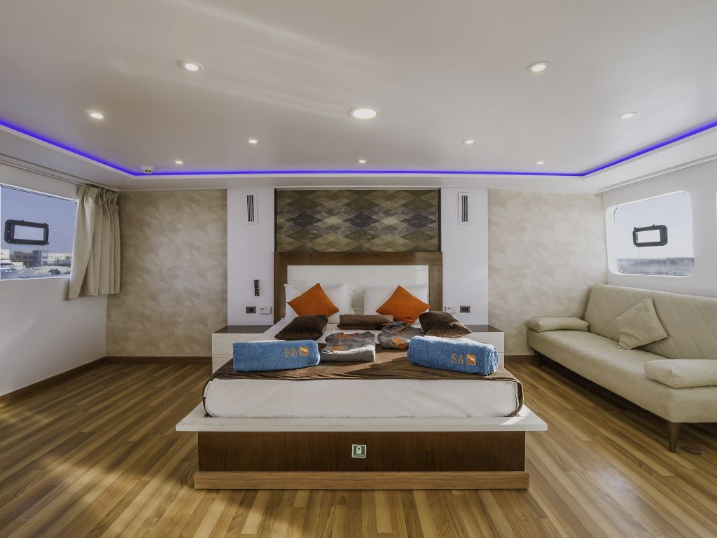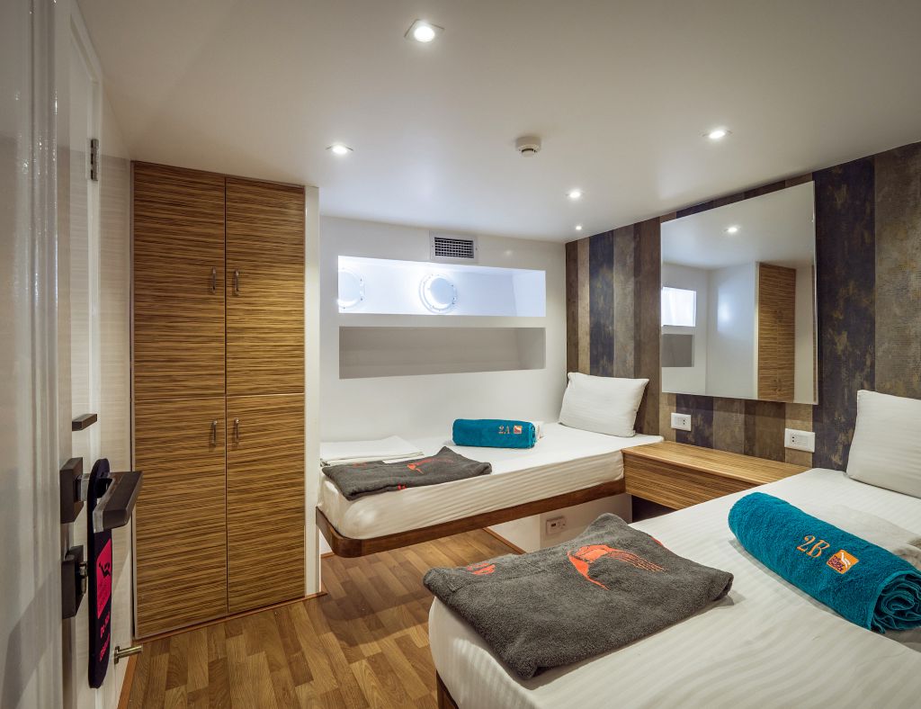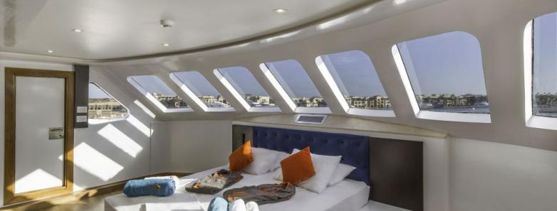 The boat accommodates a maximum of 26 guests in a total of 13 cabins: 8 standard twin-berth cabins (lower deck), 3 premium twin cabins (choice of decks), a premium, upper deck Executive Suite, and they now also have a double Junior Suite (upper deck) with an amazing panoramic view of the Red Sea. All cabins are ensuite, boast independent air conditioning, three towels and a dive poncho per guest.