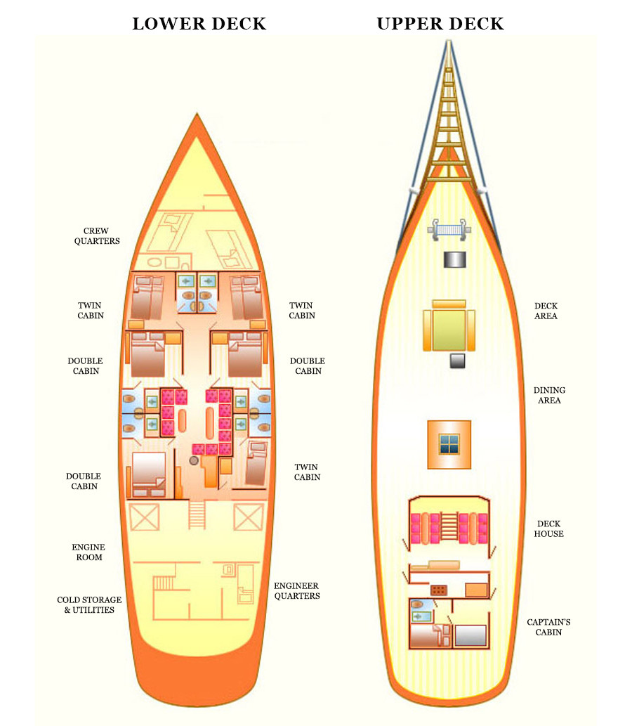 She comfortably accommodates 12 guests in 6 cabins (3 double bed cabins, 3 twin bed cabins), each with ensuite, mini safe, individually controlled air-conditioning and fan.