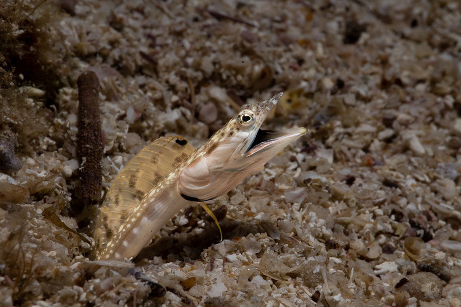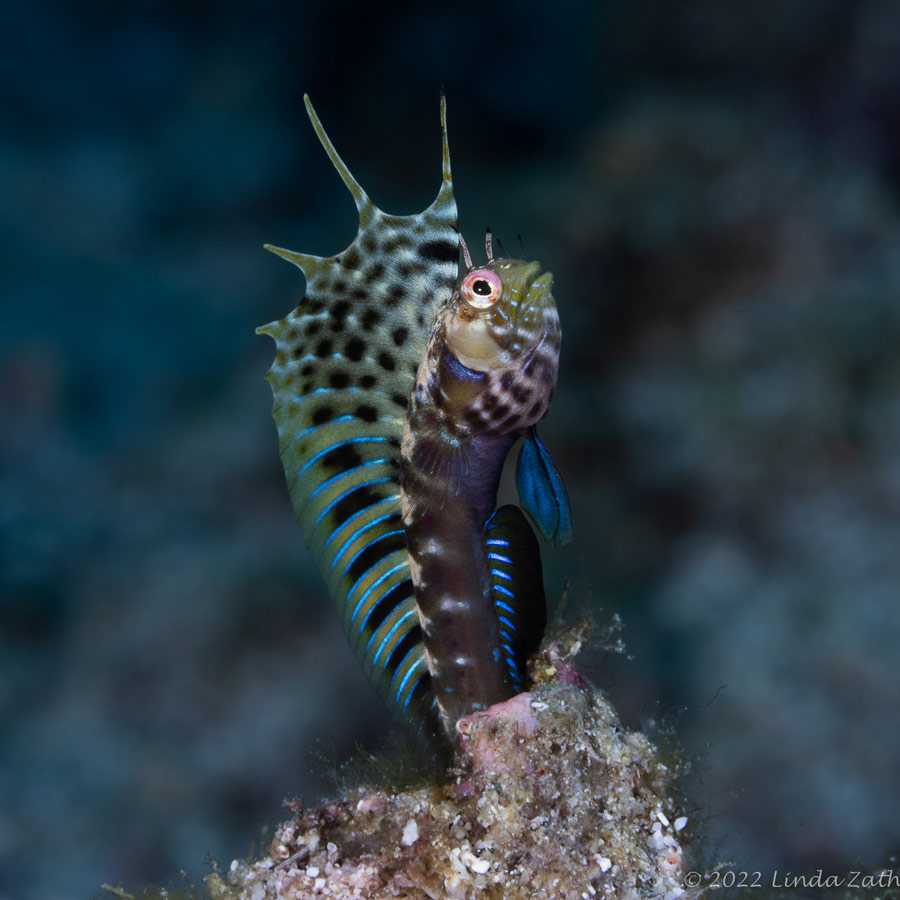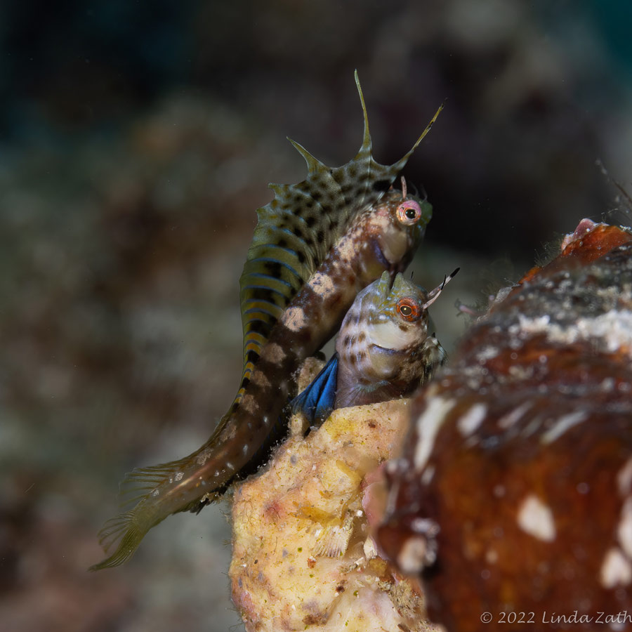 (R) Two Gulf Signal Blennies, (Emblemaria hypacanthus), fend for their territory. Photographed with Canon EOS R5 and Canon RF 100mm macro lens in an Isotta R5 housing with Ikelite DS160 Strobes at f/18, 1/160, ISO 200 by Linda Zath. // (M) A Gulf Signal Blenny flashes his dorsal fin. Photographed with Canon EOS R5 and Canon RF 100mm macro lens in an Isotta R5 housing with Ikelite DS160 Strobes at f/18, 1/160, ISO 200 by Linda Zath. // (L) A Pike Blenny makes an appearance. Photo by Scott Lucas